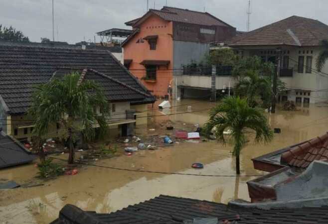 Kota Bekasi, Jawa Barat dikepung banjir akibat hujan deras. Ketinggian air banjir bervariasi hingga 300 cm alias 3 meter.