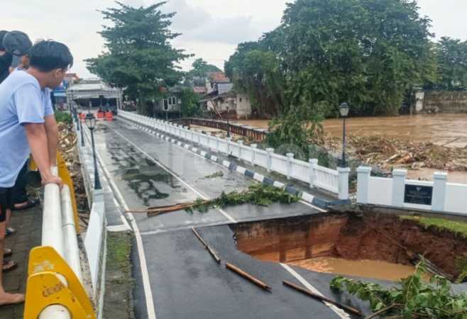 Jembatan tersebut amblas berbentuk seperti lubang karena luapan aliran Kali Bekasi.